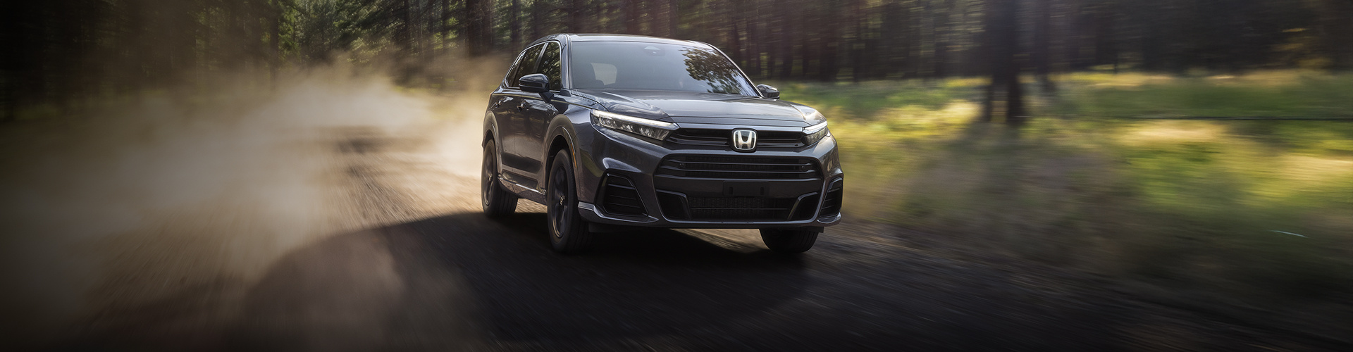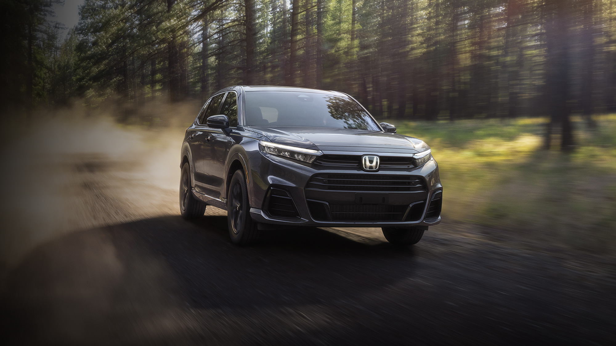 Front driver action shot of 2026 CR-V e:FCEV in Meteorite Gray Metallic driving on a forest.